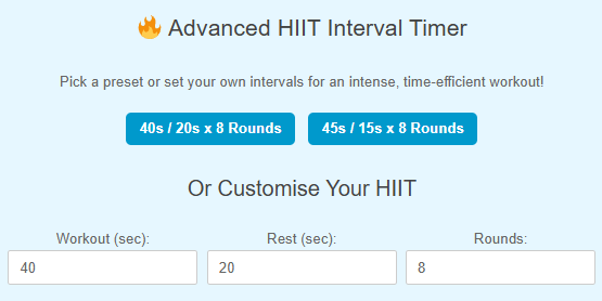 Smash your workouts with this advanced HIIT timer. Choose preset 40/20 or 45/15 intervals, or customise your own workout, rest time, and number of rounds.