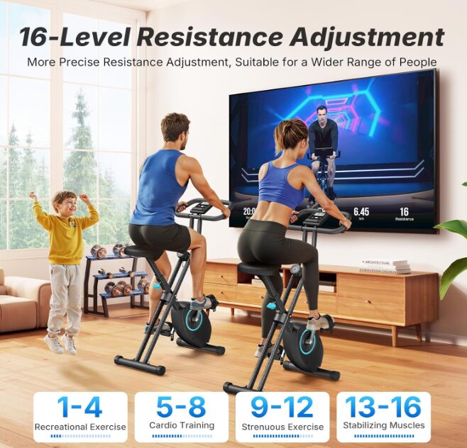 Its standout feature is the 16-level magnetic resistance, which gives more flexibility than many cheaper folding bikes that stop at eight. In real-world use, this means you can progress gradually rather than jumping from “too easy” to “too hard”. It is still not a spin bike, but for steady cardio, light intervals, and daily movement, it performs well.