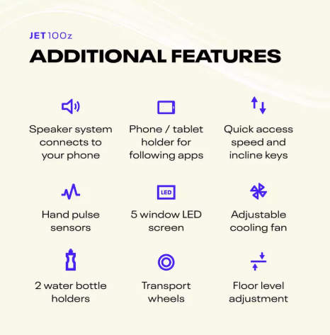 Powered by a 2.0 HP motor, the Jet 100z offers speeds up to 18 km/h and electronic incline up to 12 percent, which is more than enough for steady running, interval training, and the occasional lung-busting hill session. The Air Motion cushioning system is one of its stronger selling points, providing a forgiving feel underfoot without becoming overly soft or unstable. For longer runs, that extra joint protection is genuinely noticeable.
