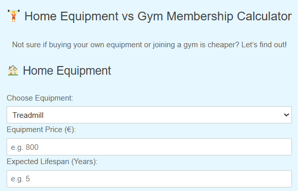 This tool crunches the real numbers: equipment cost, how many years it’ll last, your gym membership price, and even fuel costs. Enter your details and find out which route truly saves you cash in the long run.