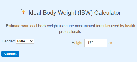 Calculate your Ideal Body Weight (IBW) in seconds using trusted medical formulas such as Devine, Robinson, Miller, and Hamwi. Find your healthy weight range and keep your goals on track with this simple, accurate tool.