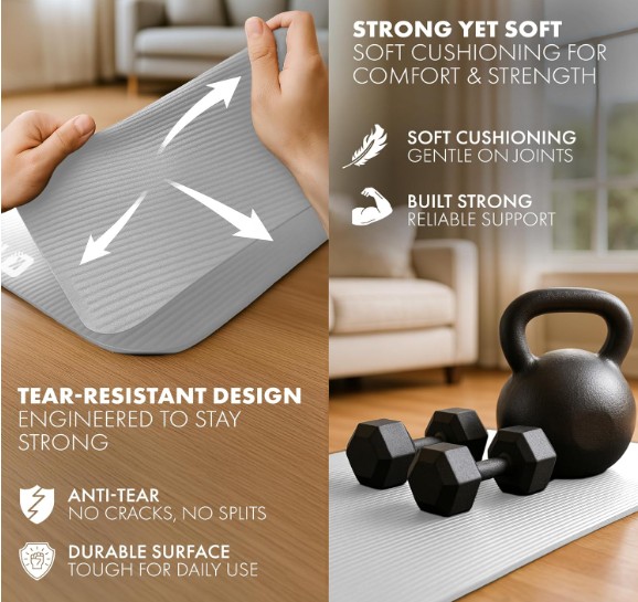 One of the most frequently praised aspects is comfort, particularly when exercising on wooden, tiled, or otherwise hard floors. Many users highlight the mat’s 6mm foam thickness as a noticeable improvement over thinner budget mats, especially for floor-based movements, stretching, and gentle strength work.