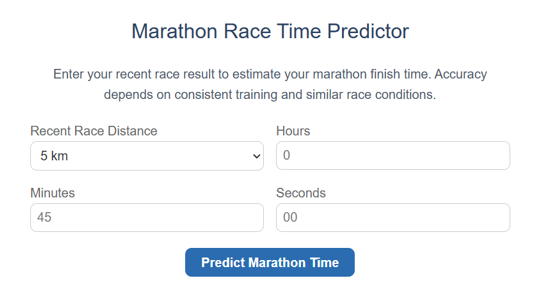 Enter your recent race result to estimate your marathon finish time. Accuracy depends on consistent training and similar race conditions.