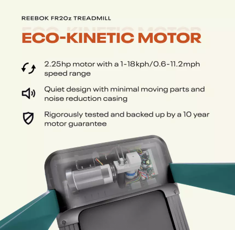 At the center of the FR20z is Reebok's new eco-Kinetic motor, which is tiny, quiet, and power-sipping but still delivers enough power to handle steady running. It produces a maximum of 2.25 HP, equivalent to about up to 18 kph (11.2 mph). That puts it solidly in the range for both beginner joggers and more seriously working runners. Reliability has also been of concern, with the motor being tested to withstand lengthy periods of time in contrast to brief bursts of velocity.