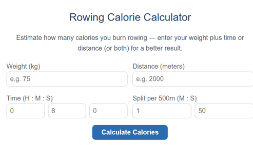 Calculate calories burned rowing on the water or indoor erg using our Rowing Calorie Calculator. Simply enter weight, distance, time or split and get instant easy-to-understand results.