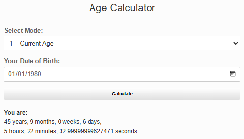 Want to know your exact age right now? Enter your date of birth, hit “Calculate”, and see your age in years, months, weeks, days, hours, minutes, and even seconds. You’ll never look at a birthday the same way again.